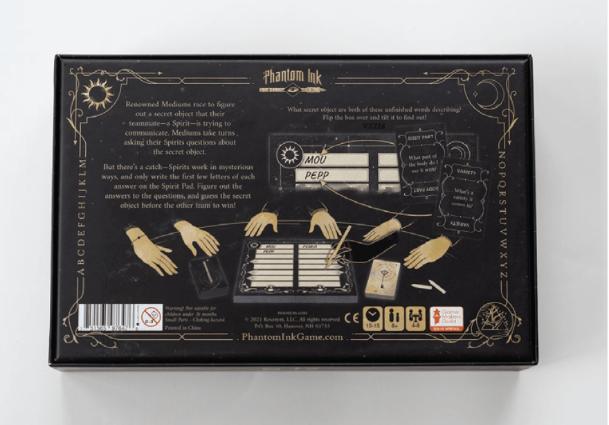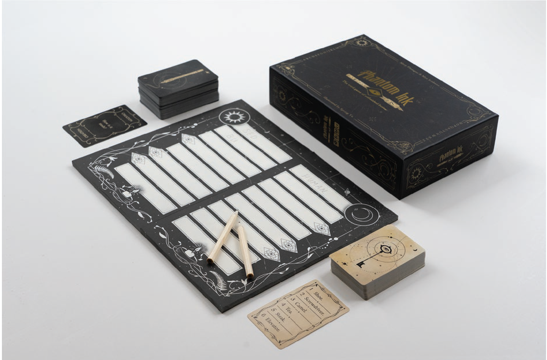 Phantom Ink is a 15-minute, party game about renowned mediums competing to prove who has the best connection with the World Beyond. To do this, mediums must correctly identify a secret object that the Spirits are trying to communicate to them.