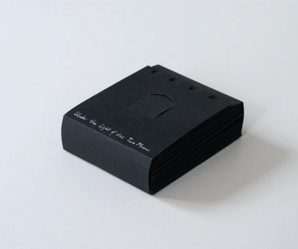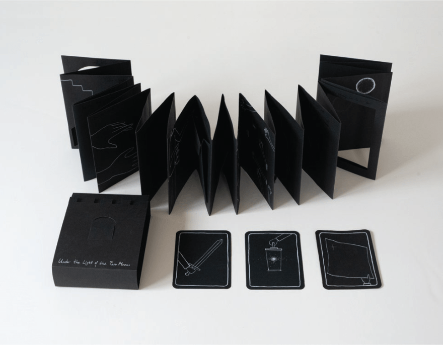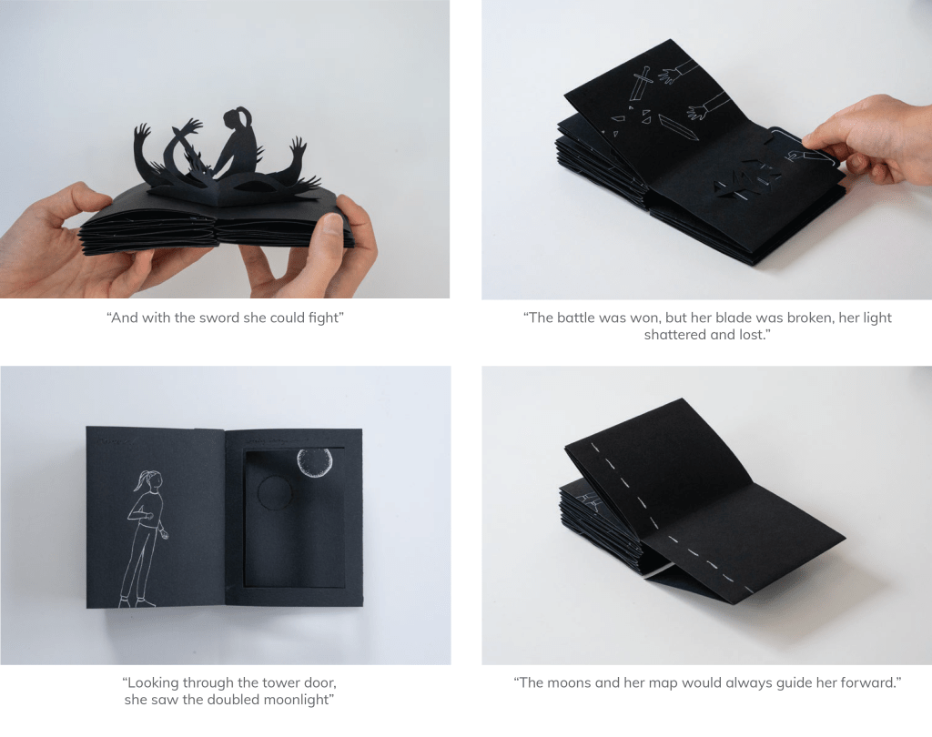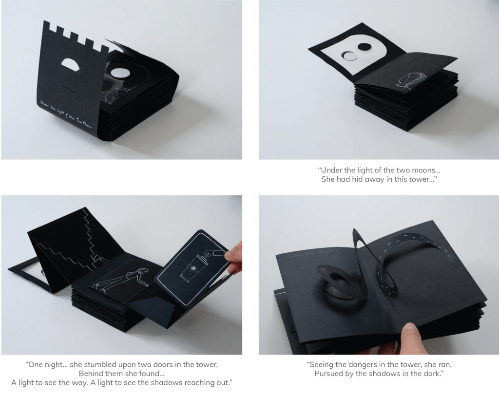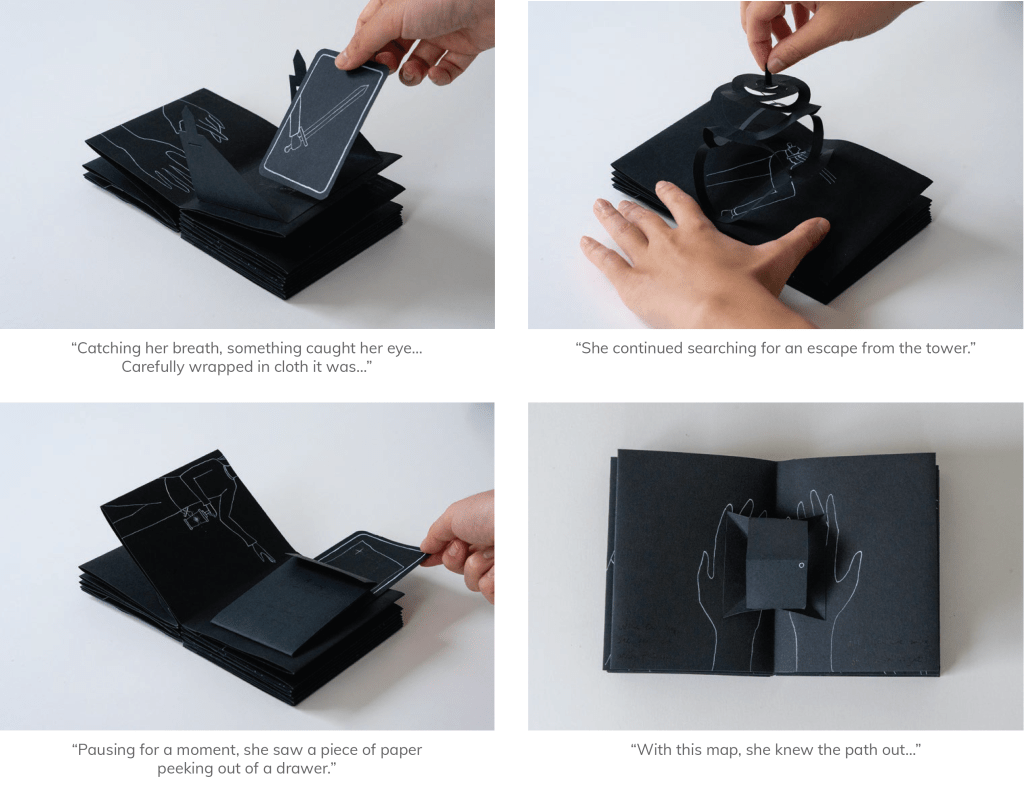 This pop-up book follows the protagonist as she escapes from a tower while being pursued by shadowy beings. The reader physically acquires items (cards) alongside the protagonist during the journey and uses them to continue the plot.